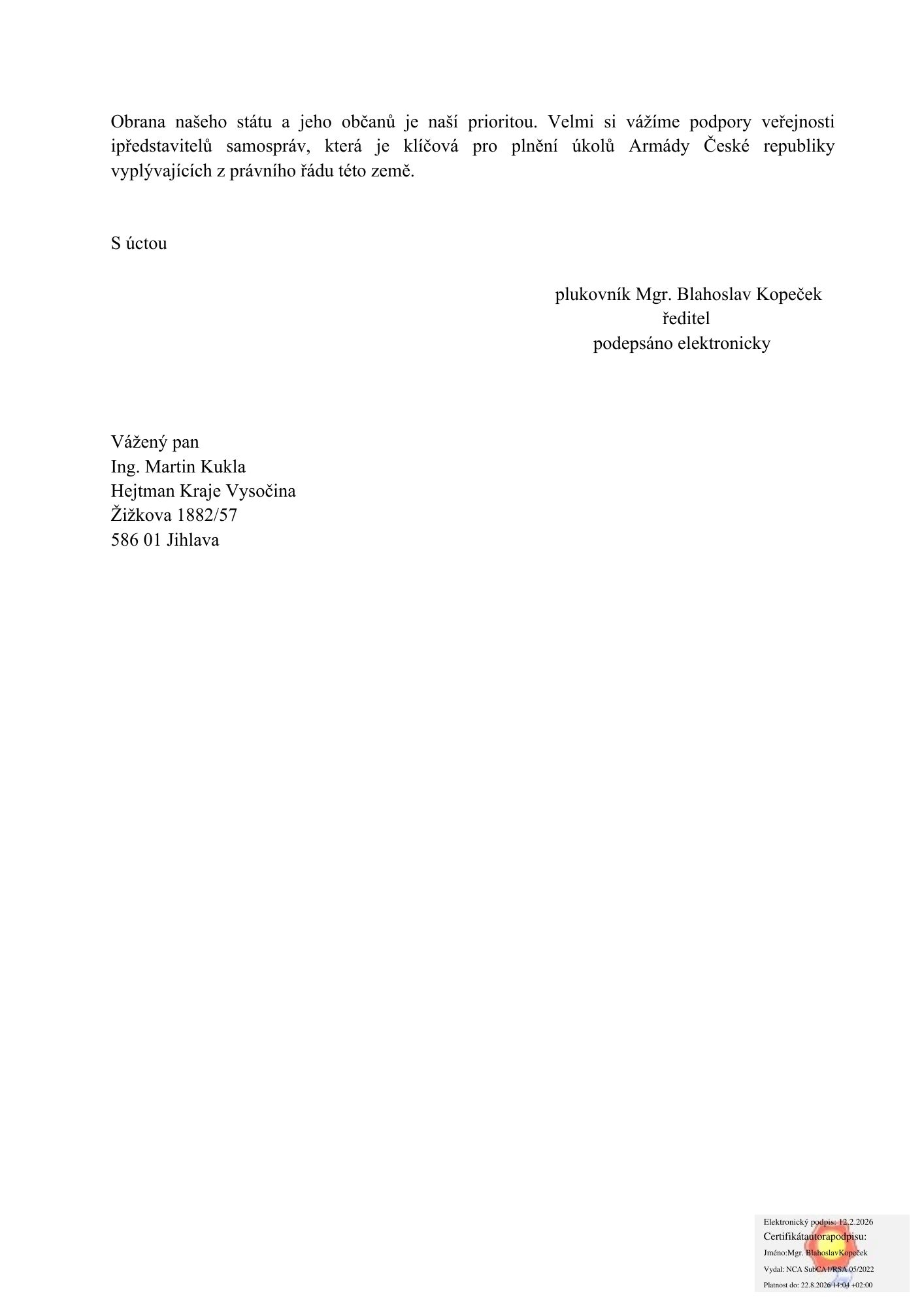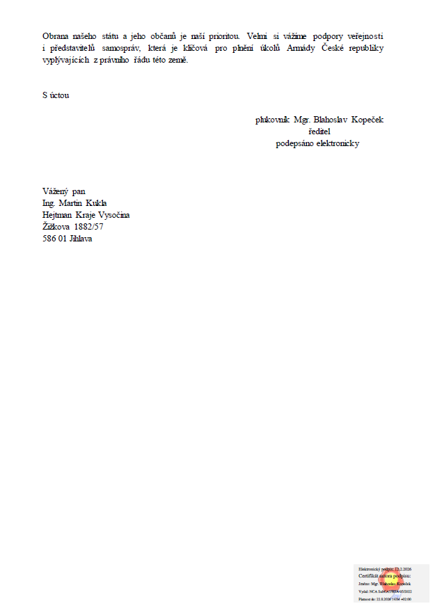 Kraj Vysočina obdržel oznámení Krajského vojenského velitelství o plánovaném zvýšeném leteckém provozu na vojenském letišti Náměšť, a to v souvislosti s modernizací a dočasnou výlukou letiště Čáslav. Podrobnější informace jsou uvedeny v přiloženém dokumentu.