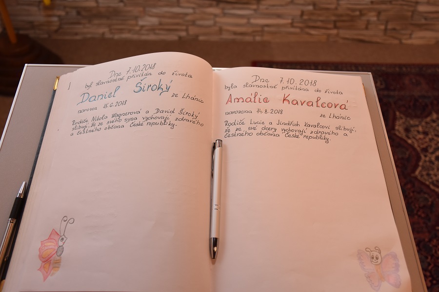 Jejich slavnostnímu uvedení do života ve Lhánicích se ujal starosta obce pan Ležák, který tak učinil ve slavnostní síni městyse Mohelno dne 7. října 2018 za účasti matrikářky, rodičů, příbuzných a známých obou dětí.